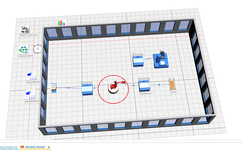 Apart from the physical model, I was manipulating with Plant Simulation and tested techniques to extract data from the model. These techniques were using chartt, Sankey Diagram, Bottleneck Analyzer, andby using the normal statistics report from the model. As shown below, this is the the Plantsim model I used to test out different techniques.